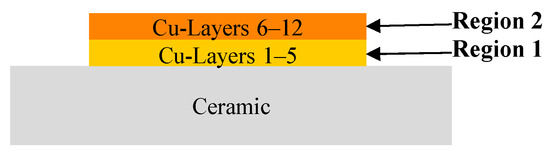 Standard metal–ceramic substrates for power electronics are commercially available as direct copper-bonded (DCB) or active-metal-brazed (AMB) substrates. The AMB process includes active elements enhancing wetting of the metal onto the ceramic, which is typically AlN or silicon nitride (Si3N4), due to its improved mechanical properties [12]. On the contrary, the DCB technology uses a gas–metal eutectic method for bonding thick Cu foil to the substrate. In an atmosphere made up of approx. 0.4 wt.% oxygen, a thin layer of copper-oxide compounds is formed on the surface of the Cu foil. Using the melting point of this eutectic at 1065 °C, the eutectic is used as an interlayer to bond the solid Cu foil to the ceramic substrate. To achieve the final distinct layout of the copper–ceramic substrate, further etching, washing, sanding, and optionally milling processes are carried out. These production processes for the substrates are long and inflexible due to specific tooling like etching masks and due to the predefinition of planar modules; therefore, design changes are cost-intensive. In DCB technology, Al2O3 and AlN ceramics are frequently used, with AlN requiring pre-oxidation in order to enable the bonding process [9,13,14,15,16].