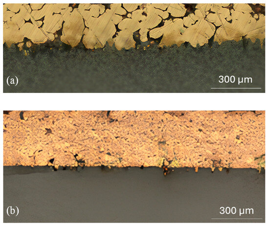 For microstructural analysis, cross-sections are prepared for PBF-LB/M-manufactured Cu on Al2O3 and AlN. As microscope pictures show, processing tracks of the laser are seen in the surface of the Al2O3 (see Figure 7a), while significantly fewer tracks are seen in the surface of AlN (see Figure 7b). The coupling of the laser beam into the AlN surface is likely inhibited by the higher hardness of AlN and by its higher thermal conductivity, which quickly dissipates parts of the heat generated by the laser beam.