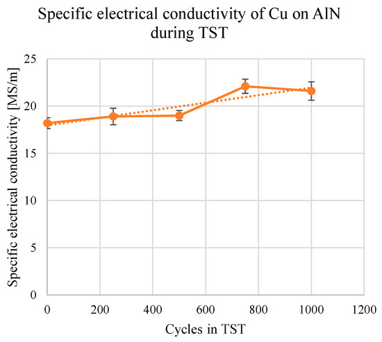 Development of specific electrical conductivity values of PBF-LB/M-manufactured copper on AlN during TST (−40 °C/+150 °C; dwell time: 15 min).