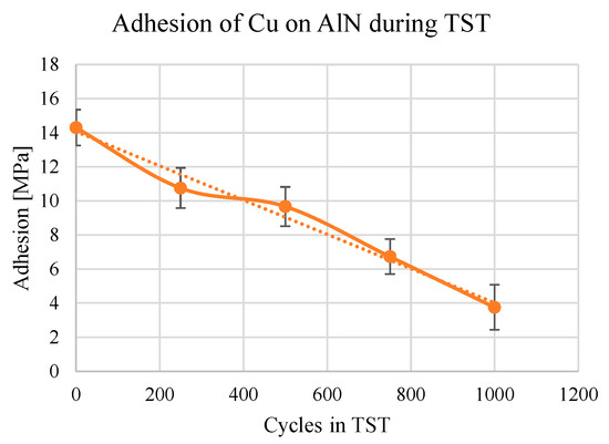 Development of adhesion values (shear testing) of PBF-LB/M manufactured Cu on AlN during TST (−40 °C/+150 °C; dwell time: 15 min).