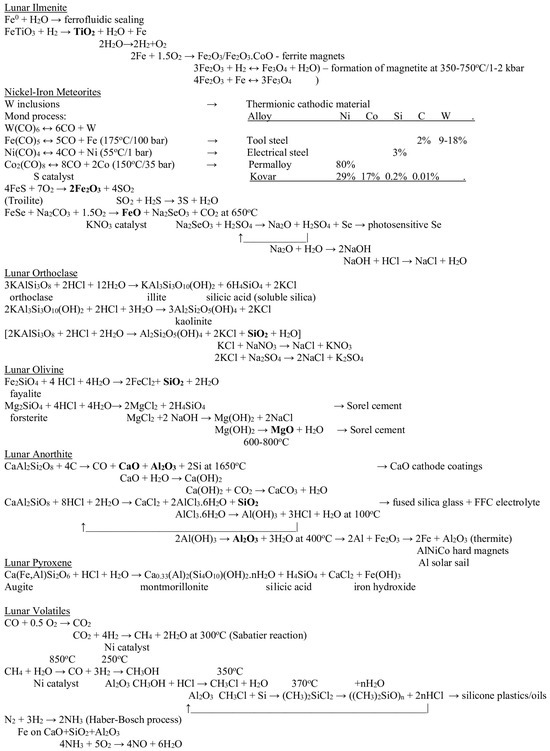 We focussed primarily on the core of the lunar industrial ecology—the processing of the lunar highlands mineral anorthite. We adopted a geomimetic approach—geomimetics involves inspiration from the synthesis of natural materials through geological processes, such as hydrothermal vent processes at a high temperature and pressure [29]. We have exploited a geomimetic technique inspired by geochemical weathering by weak carbonic acid, such as the dissolution of plagioclase feldspar into kaolinite and calcite [30]: