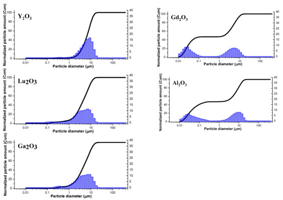 Results of dispersibility study of Y2O3, Gd2O3, Lu2O3, Al2O3, Ga2O3 in the range of 0.01–50 μm.