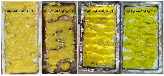 Photographs of samples Gd2YGaAl4O12:Ce, GdY2Ga3Al2O12:Ce, Gd2LuGaAl4O12:Ce, and GdLu2GaAl4O12:Ce.