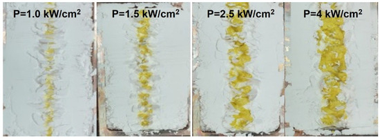 Obviously, the ceramics realization process formation under the radiation effect of synthesis is possible when the threshold power density Pf is exceeded. With decreasing average power density Pc, the synthesis will be realized as long as PL exceeds Pf—the bandwidth of synthesized ceramics in the “without scanning” mode—decreases. This effect is shown in Figure 5.