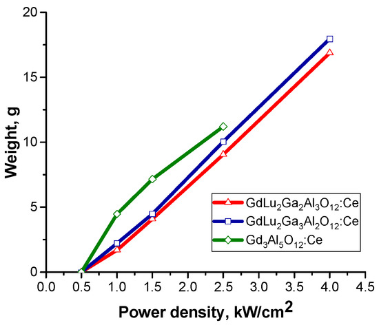 The synthesis efficiency under such processing conditions is most appropriately evaluated by the mass of the resulting sample obtained under specified radiation exposure parameters. The dependencies of the synthesis efficiency on the radiation flux power density for high-entropy ceramics GdLu2Ga3Al2O12:Ce, GdLu2Ga2Al3O12:Ce, as well as for the ternary compound Gd3Al5O12:Ce, are presented in Table 2 and Figure 4.