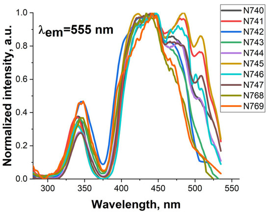 Luminescence excitation spectra at λem = 555 nm of synthesized ceramic samples.