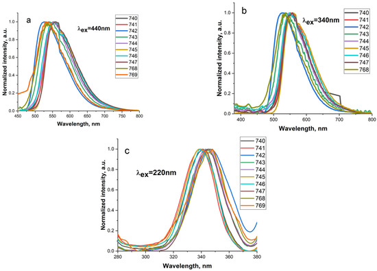 Figure 7 shows the luminescence spectra of the samples under excitation in the 420–445, 340–345, and 220 nm regions.