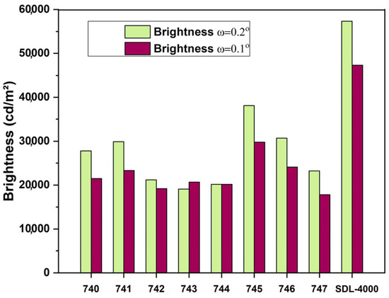 To measure relative brightness values, a custom setup was developed based on a CS-200 luminance meter, with a fixed spatial arrangement of all components. Ceramic samples in powdered form were placed into cuvettes, which were securely mounted in the measurement chamber using a sample holder. The brightness measurements were carried out with periodic calibration against the reference phosphor SDL-4000 (NPO PLATAN), which served as a standard. Measurements were performed at two solid angles, ω = 0.2° and ω = 1.0°, corresponding to luminescence areas of approximately S ≈ 1 mm2 and S ≈ 17 mm2, respectively. The measured brightness values for both the ceramic samples and the reference are presented in Table 4 and illustrated in histogram form in Figure 8. The table also includes the chromaticity coordinates of the sample luminescence in the CIE color diagram.
