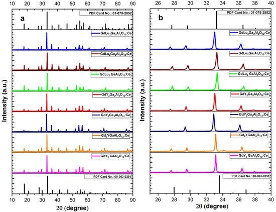 The lattice parameters of the primary garnet phases vary within the range of approximately 12.02–12.20 Å, reflecting compositional differences due to cation substitution by Gd3+, Y3+, Lu3+, Ga3+, and Al3+. Corresponding unit cell volumes range from ~1738 to ~1815 Å3, with densities spanning from about 5.0 to 6.5 g/cm3 depending on the ionic radii and mass of the substituents. Average crystallite sizes are in the submicrometer domain, typically between 800 and 1250 Å.