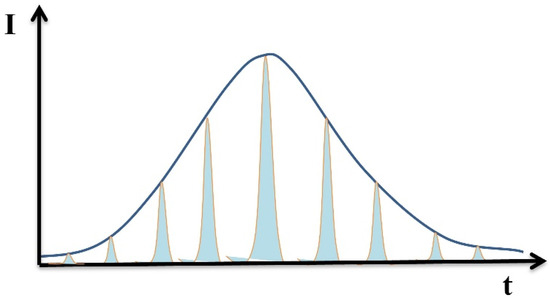 During the radiation-induced synthesis, an extremely efficient exchange of elements between the particles of the five components of the mixture is realized. It is postulated that ionization processes play a critical role in the formation of the ceramic phase. Useful information on the rate of exchange processes can be obtained from studies of synthesis in the “with scanning” mode. In this mode, each elementary section of the mixture is exposed to a series of pulses of scanning electron flux with a frequency of 50 Hz. The pulse intensity increases as the beam approaches a given point and decreases as it moves away due to crucible displacement. A schematic representation of the pulse sequence for an individual segment of the mixture is shown in Figure 10.