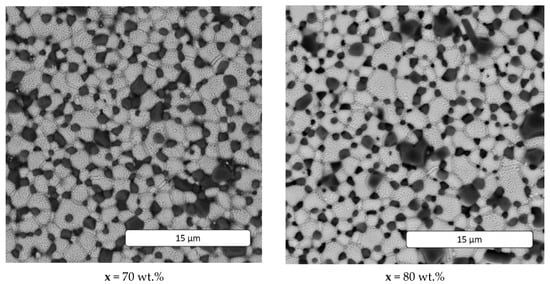 The microstructure of the sintered tablet’s unpolished surface is shown in the SEM images in Figure 5. As can be seen from the images, two contrasting areas can be distinguished—light grains and dark grains. The dark areas correspond to MgO and Mg-Al spinel grains, while the light ones correspond to the c-ZrO2 phase. For better illustration, EDX elemental maps are also shown in Supplementary Figures S11–S18. MgO grains are rounded and larger in size, reaching 10 μm at low concentrations, while spinel grains are polygonal. Some micrographs show grains of tungsten oxide or wolframite. The surface of the zirconium dioxide grains, starting with a concentration of x = 20 wt.%, has a developed morphology with extended pores, grooves and convolutions. Based on the results of ZrO2-MgO ceramics, where high-resolution electron microscopy images are available, this type of zirconium dioxide grain is acquired due to the eutectoid decomposition c-(Zr1−xMgx)O2 → m-(1 − x)ZrO2 + xMgO [,]. In addition, high-temperature annealing can cause the volatilization of Mg atoms from the ceramic surface []. During the volatilization process, defective regions with a high concentration of vacancies are created, which migrate along the grain surface and form extended voids.