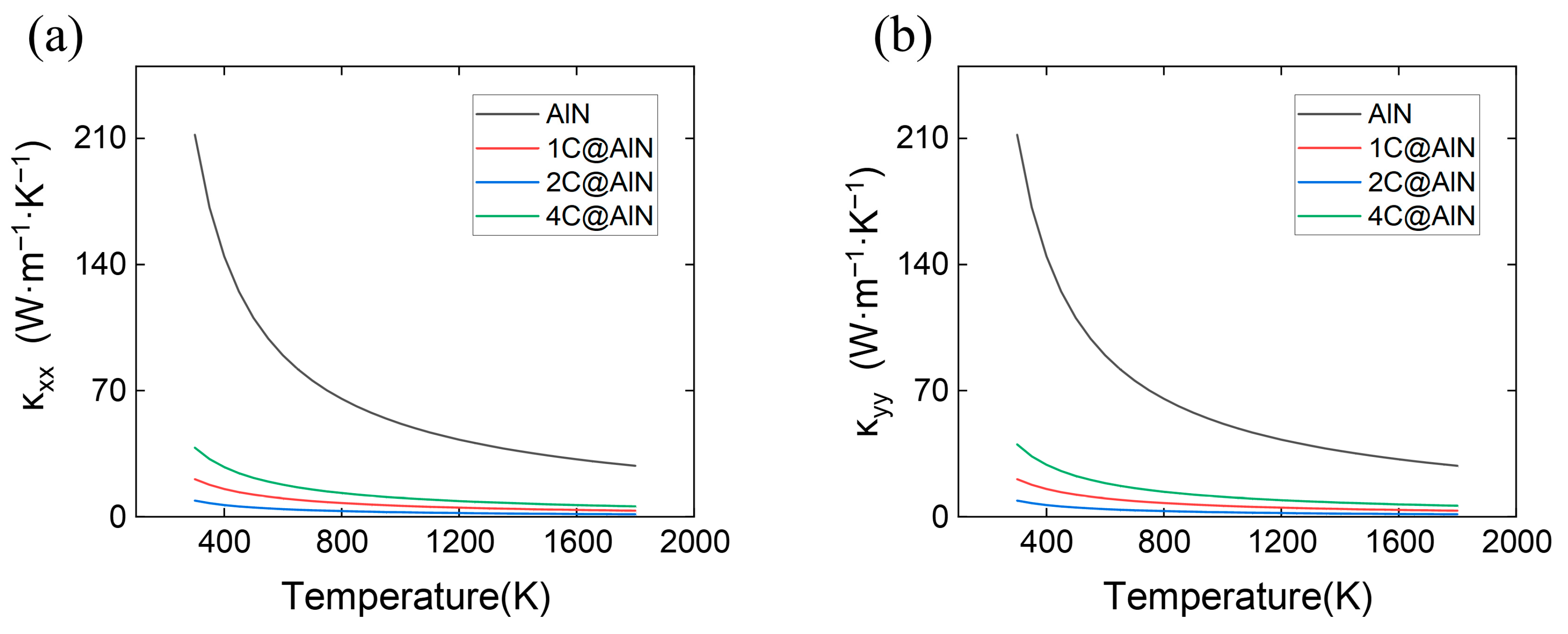 - Banerjee, A.; Dasb, B.K.; Chattopadhyay, K.K. Significant enhancement of lattice thermal conductivity of monolayer AlN under bi-axial strain: A first principles study. Phys. Chem. Chem. Phys. 2022, 24, 16065–16074. [Google Scholar] [CrossRef] [PubMed]