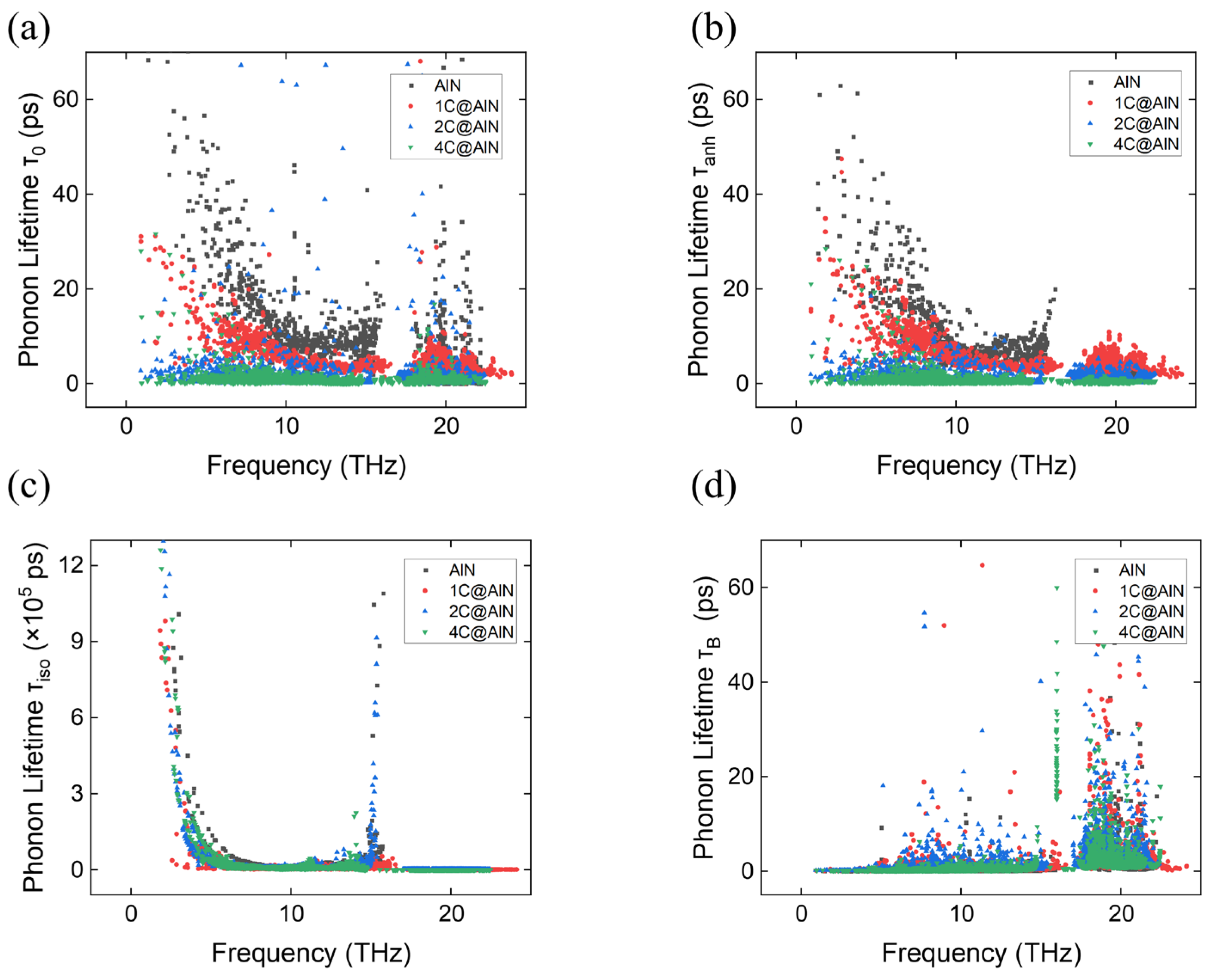 AlN-(O,C,Vac) | Point defects | DFT | O impurities and Al vacancies most detrimental to κ | [16] |