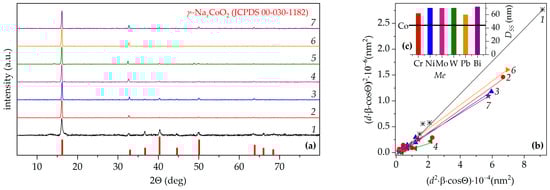 X-ray powder diffractograms (CuKα–radiation) (a), size-strain plots (b) and coherent scatting area (c) for Na0.89CoO2 (1, black) layered sodium cobaltite and Na0.89Co0.9Me0.1O2 (Me = Cr (2, red), Ni (3, blue), Mo (4, pink), W (5, green), Pb(6, orange), Bi (7, purple)) solid solutions.