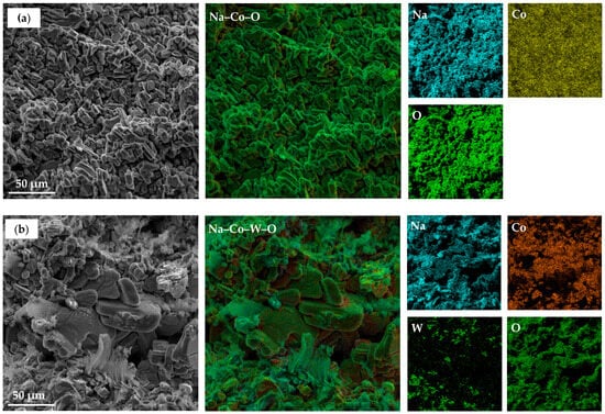 Element mapping images of the Na0.89CoO2 (a) and Na0.89Co0.9W0.1O2 (b) ceramic samples.