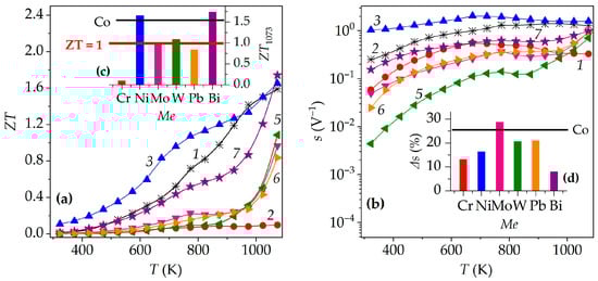 The self-compatibility factor values (s) of the ceramics studied increased at temperature increasing and within temperature interval 673–873 K slightly vary (except for Na0.89Co0.90Cr0.10O2 compound) (Figure 6b), and dimensionless relative self-compatibility factor (Δs) of Na0.89Co0.90Me0.10O2 layered cobaltites within 673–873 K varies within 8–29% (Figure 6d), which is, in the whole, less than for the Mg2Si0.6−ySn0.4Sby (25–40%) thermoelectric alloy [] and states the good self-compatibility of the obtained in this work thermoelectric oxide ceramics. Note, that Δs values for the doped sodium cobaltites, except Na0.89Co0.90Mo0.10O2, were less (8–21%) than for the base layered sodium cobaltite (26%), which shows the effectiveness of doping of Na0.89CoO2 by transition or heavy metal oxides in increasing of its self-compatibility.