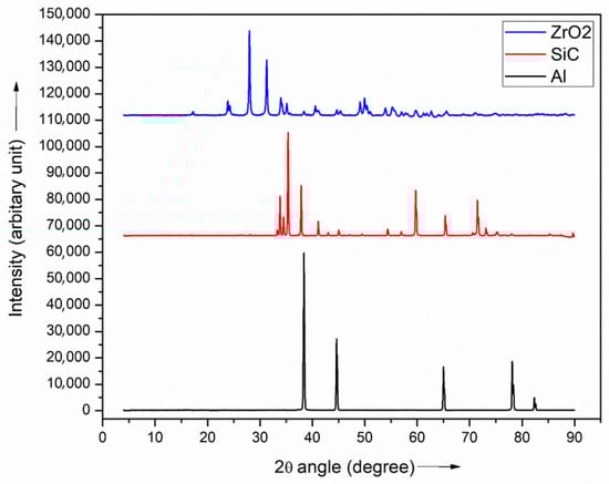 XRD analysis of raw materials, pure aluminum powder, ZrO2, and SiC before fabrication of MMCs.