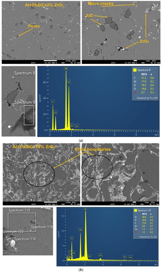 - The appearance of Al, Si, C, Zr, and O in EDS spectra confirms the effectiveness of ball milling and sintering of composites for all fabrication conditions.