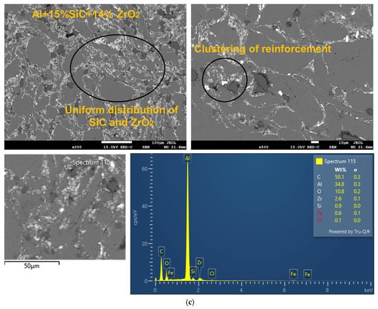 Microstructural studies of all fabricated MMCs are carried out after applying an etchant to polished samples. SEM analysis with EDS spectra is analyzed for 25 numbers of MMC samples fabricated under various conditions as mentioned in Table 3. Figure 5a–c depict SEM-EDS micrographs and grain size distributions of the manufactured hybrid Al-based composites, which were fabricated on various combinations of process parameters at two magnifications, i.e., 200× and 500×. Figure 5a presents the fabricated MMCs with 3wt.% of SiC and 2wt.% of ZrO2 at a milling time of 20 min, sintering temperature of 500 °C, and sintering time of 80 min, respectively. MMC with 7 wt.% of SiC and 14 wt.% of ZrO2 MMCs, fabricated at a milling time of 60 min, sintering temperature of 500 °C and 90 min sintering time is displayed in Figure 5b. At a milling time of 80 min, sintering temperature of 560 °C, and sintering time of 80 min, the MMC with 15wt.% of SiC and 14%ZrO2 is shown in Figure 5c. The SEM images demonstrate that the SiC and ZrO2 are equally dispersed across Al matrix, proving that high-energy ball milling is an effective way for milling powder mixtures. A homogeneous spreading of reinforcement elements over Al matrix composites is required for the enhanced characteristics of hybrid MMCs. The SEM investigation also reveals no significant agglomeration or other microstructural flaws. The presence of reinforcement particles with different colors, such as SiC (grey) and ZrO2 (white), as shown in Figure 5a is observed as homogeneous over the Al matrix for all the fabrication conditions. It was detected that the grains are properly aligned with grain borders and have been reinforced in such a way that dislocations cannot easily pass through. A larger region of grain boundaries can be seen in Figure 5b, indicating the occurrence of more interfacial precipitation. This strengthens the interfacial bonding and consequently enhances mechanical properties []. Higher sintering temperatures caused stronger consolidation of powder particles, as evident from Figure 5c. This consequently helps to achieve porosity levels []. However, greater sintering temperatures caused more interfacial precipitation, which is why the composite samples supplemented with higher wt.% of SiC and ZrO2 showed some agglomeration (Figure 5c). Porosity is a crucial factor in PM techniques, influencing composite mechanical characteristics and performance. Density, interfacial bonding, and metallographic defects such as porosity and microcracks all have an impact on the mechanical properties of hybrid composites. However, we observed relatively few microcracks and pores during the SEM study.