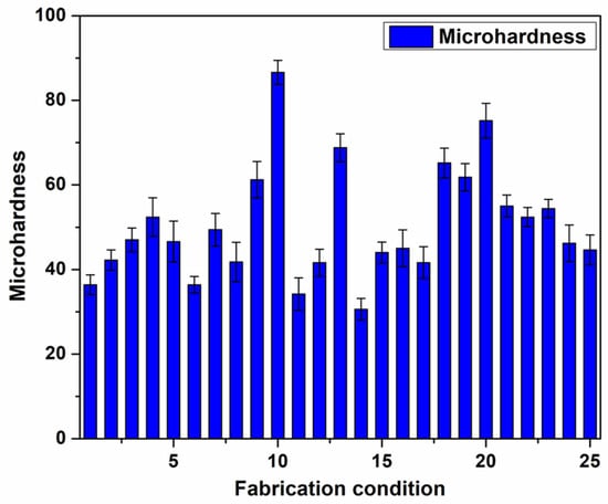 Table 3 presents the results of the Vickers hardness at various combinations of process parameters. As evident in Table 3, fabrication condition 10 produced the greatest microhardness value of 86.6 HVN, while fabrication condition 14 offers the lowest hardness of 30.6 HVN. The microhardness values of all MMCs at 25 fabrication conditions are shown in Figure 6. The hybrid Al-based composite that has the optimal hardness value was fabricated at 7 wt.% SiC and 14 wt.% ZrO2, milling time of 60 min, the sintering temperature of 500 °C, and sintering time of 90 min.