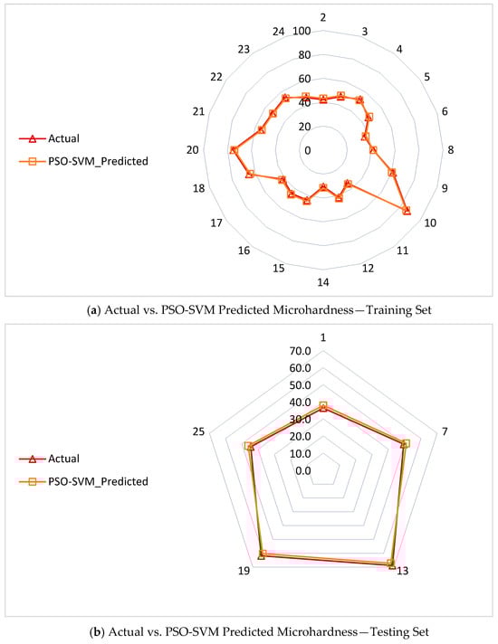 The low values obtained for key statistical performance metrics including R2, RMSE, MAE, and MAPE across both the training and testing datasets clearly indicate the strong predictive capability of the proposed PSO-SVM model in estimating microhardness. These consistently favorable results highlight the model’s generalization ability and accuracy in capturing the underlying relationships between input parameters and the target output. Consequently, the PSO-SVM framework demonstrates considerable potential as a reliable tool for modeling and can be effectively leveraged to optimize process parameters for achieving targeted microhardness levels. This underscores its applicability in advanced material design and process control.