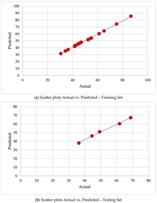 Scatter plot of actual vs. predicted microhardness with perfect fit line (y = x) for (a) training and (b) testing.
