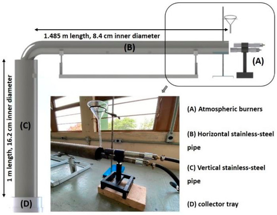 In order to produce the Type IB microspheres, the glass was crushed with a mortar and pestle, and the resulting fragments were sieved using mesh sizes of 63 μm, 150 μm, 212 μm, and 300 μm to obtain the desired particle size distribution. Fragments retained in the coarser sieves were re-ground and re-sieved until they fell within the specified size range. Particles smaller than 63 µm were stored for the production of new glass. Different manufacturing methods can be implemented for microsphere production [12]: in this work, a lab-made horizontal flame spheroidization method was applied. The apparatus consisted of a horizontal stainless-steel pipe (1485 mm length, 84 mm inner diameter) connected to a vertical stainless-steel tube (1000 mm height, 162 mm inner diameter) via a 90° elbow. Crushed glass fragments were fed through a funnel positioned above the flame. The particles were heated by two atmospheric burners made of galvanized steel, positioned in parallel to increase the particle residence time within the flame. The burners were supplied by a 13 kg LPG cylinder, operating at an outlet pressure of 1 atm. Air intake regulation was achieved through a vertical slit located at the rear of each burner, equipped with an adjustable screw mechanism. This configuration allowed for fine control of the air-to-gas ratio by modifying the slit opening, enabling efficient aspiration of ambient air by the LPG flow and ensuring proper gas mixing. As a result, the flame characteristics could be effectively adjusted to optimize the heating conditions. Upon exposure to the flame (approx. 1000 °C), the fragments softened and spheroidized due to surface tension while flying, and they were collected at the bottom of the vertical tube in an aluminum tray. Figure 1 presents a photograph and a schematic diagram illustrating the details of the manufacturing process employed. The used method proved suitable for the fabrication of microspheres with diameters up to 300 µm.