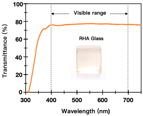 Once the glass samples were fabricated, they were characterized using UV-Vis spectrophotometry, and the refractive index was determined based on the Brewster angle method. Figure 2 presents the UV-Vis spectrum of a sample with 3 mm thickness, highlighting the visible region of the electromagnetic spectrum (400–700 nm), with the inset of a typical sample obtained under the selected fabrication conditions. As observed, from 400 nm to 700 nm, the glass exhibits very high and nearly constant transmittance, which characterizes it as colorless. The measured refractive index, accounting for the goniometer uncertainty, was 1.55 ± 0.03, a typical value for silica-based glasses [25].