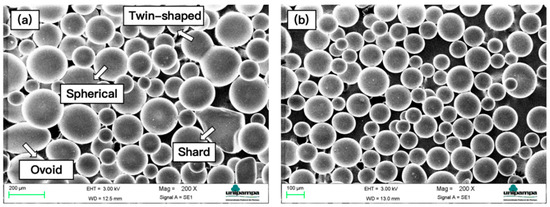 Figure 3 shows scanning electron microscopy images of the microspheres. Figure 3a displays a representative image of commercial microspheres, where different geometrical outcomes resulting from the production process can be identified, such as spherical microspheres (predominant), shards, ovoids, and twin-shaped particles. Figure 3b, in turn, presents a representative image of RHA-based microspheres. In this image, the particles exhibit a predominantly spherical morphology, with diameters ranging from approximately 50 to 180 µm.
