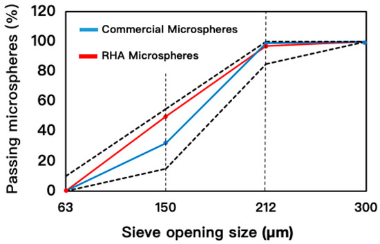 During the morphological analysis that resulted in Table 3, it was also possible to assess the diameter of the produced microspheres. In this case, only particles with a spherical shape were considered. Figure 4 displays the percentage distribution of microspheres retained by different sieves as a function of the sieve aperture. The dashed black lines indicate the size limits defined by the Brazilian standard for Premix-type (Type IB) microspheres. As shown, the particle size distributions of both the commercial and RHA-derived samples fall within the specified range, confirming their compliance with national regulations and classifying the manufactured microspheres as suitable for Premix-type applications.
