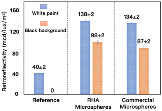 After validating the production process with respect to the physical characteristics and chemical composition, the retroreflectivity performance of both RHA and commercial microspheres was evaluated on matte black (unpainted) and white (painted) surfaces. The measurements were carried out using the 15 m geometry, which is the standard configuration adopted by most road authorities in Brazil [29]. Typically, Type IB glass beads are premixed into the road marking paint at a concentration of 250 g/L [33]. Here, a lower density of 1.7 g per test area (equivalent to 85 g/L) was selected for both samples. This reduced amount was intentionally chosen to prevent bead overlap, which could affect the consistency of the measurements. The primary objective of these measurements was not to achieve the highest possible retroreflectivity [34], but rather to compare the retroreflective performance of the RHA-based microspheres with that of their commercial counterparts of the same type. For the unpainted configuration test case, a matte black board served as the reference surface, whereas for the painted configuration case, the reference consisted of the white paint film, both without microspheres. Figure 5 presents the retroreflectivity results obtained for both samples, considering the particle size distribution described in Figure 4. As expected, both sample types showed substantial increases in retroreflectivity compared to their respective controls. More importantly, the results revealed that RHA-based microspheres exhibited retroreflectivity values comparable to those of commercial glass beads, supporting their potential implementation in road marking applications.
