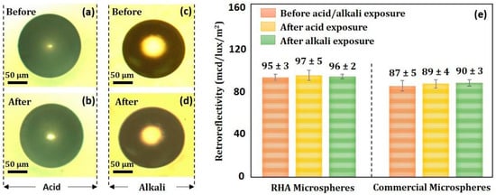 Moreover, the evaluation of glass microspheres under chemical attack from hydrochloric acid and calcium chloride resistance test is essential to assess the microspheres durability against chemical agents commonly found in the environment, such as acid rain or cleaning products used in traffic areas [11,12]. These agents can degrade the microsphere surface over time, potentially altering key properties such as surface integrity, adhesion to paint, and their retroreflective performance, reducing road marking visibility and thereby increasing the risk of traffic accidents. Figure 6a,b and Figure 6c,d shows representative images of the RHA microspheres before and after immersion in hydrochloric acid and calcium chloride, respectively. No visible alterations in the surface appearance (shine or hue) were observed for either sample, indicating resistance to hydrochloric acid and CaCl2-induced surface degradation. To complement this analysis, retroreflectivity measurements were also carried out before and after each chemical exposure to verify whether the optical performance was compromised. The results, as reported in Figure 6e, also showed no significant change, confirming the chemical stability and performance reliability of the RHA glass microspheres under both hydrochloric acid and CaCl2 exposure.