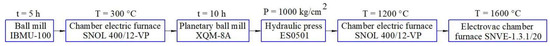 Primary grinding (mixing) was carried out in a ball mill IBMU-100-2 (Ht Machinery Co., Ltd., Wuxi, China). Drying for moisture evaporation and the burning out of the organic binder was carried out in an oxidizing environment at Tmax = 1200 °C using an electric furnace SNOL 400/12-VP (VNIIETO, Istra, Russia); the accuracy of temperature maintaining was ±5 °C.
