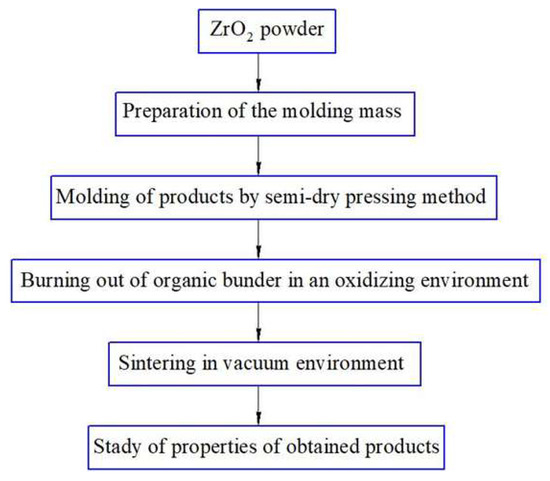 Flow chart of obtaining ceramic samples from ZrO2 powder by the semi-dry pressing method.