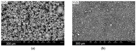 Zirconium oxide particles are predominantly rounded in shape, including agglomerates and particles with a fragment morphology. The particle size varies from 20 to 100 μm. Yttrium oxide particles are represented by fragments of an exclusively fragmentary shape, 20–100 μm in size.