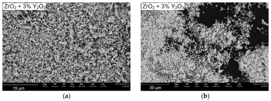 SEM images of ZrO2 + 3 mol. % Y2O3 mixture after calcination and co-milling at different magnification: (a) 9200×; (b) 3600×.