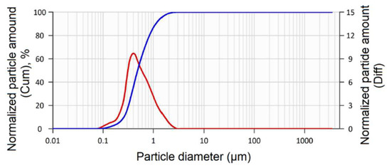 Cumulative (blue) and differential (red) particle size distribution of the powder mixture of ZrO2 + 3 mol. % Y2O3. D10 = 0.256 µm; D50 = 0.482 µm; D90 = 1.108 µm.