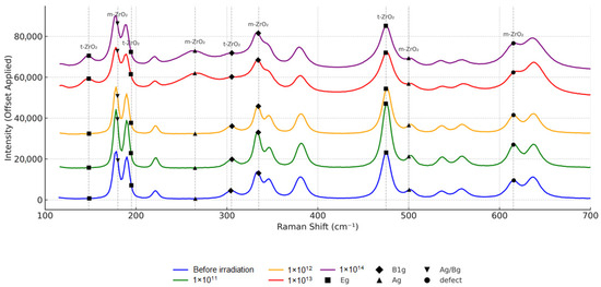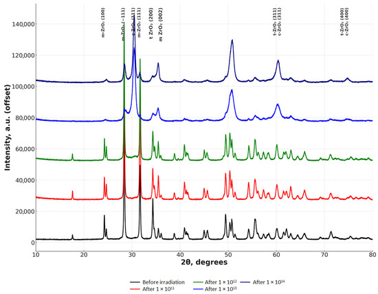 Phase transitions during irradiation occur sequentially: first (low fluences), the monoclinic phase is destroyed. Then, the tetragonal phase stabilizes; at high fluences, a cubic phase appears, characteristic of highly defective crystalline structures. At critical fluences (1 × 1014), the process goes so far that zirconium dioxide begins to lose its crystalline order, and its structure acquires signs of an amorphous state.