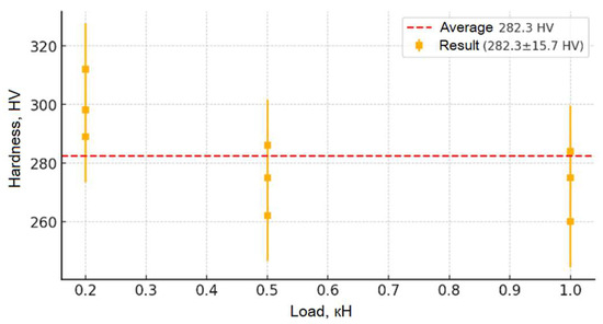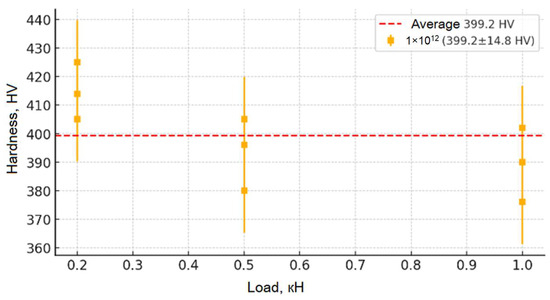 Figure 9, Figure 10, Figure 11, Figure 12 and Figure 13 show the results of the study of the microhardness of the synthesized ceramic samples. Analysis of the presented graphs allows us to trace in detail the changes in the microhardness mechanisms of the samples depending on the applied load and the irradiation fluence. The initial (non-irradiated) sample of moderate hardness (~280 HV) remains relatively stable in the average value (from 0.2 to 0.5 kN), which indicates the originality of its structure and the absence of significant concentrations of defects and internal stresses. However, at low loads (less than 0.05 kN), slightly increased hardness values are observed, which may be due to the presence of a surface layer with increased structural stresses causing local deformation. With an increase in the penetration depth of the indenter (loads up to 0.5 kN), the hardness values stabilize, confirming the depth of the inner layer of the material and its resistance to moderate mechanical impacts. At higher loads (above 0.5 kN), a slight decrease in hardness is observed, which allows us to explain the change in depth in the indenter recesses, involving deeper layers with other structures in the measurement, as well as the accumulation of local defects and the formation of microcracks, leading to partial destruction of the structure.