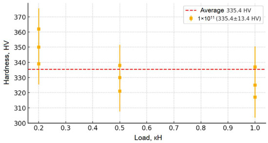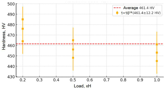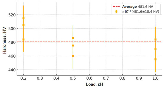 From the moment of receiving the irradiation fluence (from 1 × 1011 to 1 × 1013), the microhardness of the samples increases significantly (up to ~480 HV for the fluence of 1 × 1013), which indicates radiation-induced changes in their crystalline stage. First, this is due to the formation of point defect centers (vacancies, interstitial atoms) and dislocation networks that cause dislocation movement and hinder plastic deformation, which leads to the strengthening of the material. However, a broader study of the irradiation fluence (1 × 1014) reveals a slight decrease in hardness compared to the fluence of 1 × 1013, which may be due to the onset of stress relaxation processes, partial recrystallization, or local amorphization of the structure, leading to a weakening of the physical strength. Despite this, the general picture of the change in hardness depending on the load is evident: at low loads, its increase is observed due to surface stresses; on average, it stabilizes; and at high loads, a slight decrease is recorded, which leads to an increase in microdamage. This set of changes allows for an impact on the mechanical properties of the material and allows us to draw a conclusion about its resistance to moderate loads, as well as about possible structural changes at maximum radiation fluences.