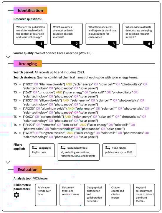 In the context of solar energy research, bibliometric tools provide valuable insights into how specific materials, such as binary metal oxides, are integrated into device architectures, studied across disciplines, and adopted by different scientific communities [,,,]. By quantitatively assessing publication trends, citation impact, and keyword co-occurrence, bibliometric analysis complements experimental and theoretical approaches, offering a macroscopic view of knowledge production and research activity [,,,].
