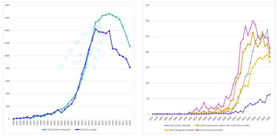 Key observations indicate that TiO2 and ZnO remain the primary subjects of research, while other materials such as Al2O3, Fe2O3, WO3, and CeO2 occupy more specialized niches.