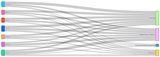The Sankey diagram (Figure 3) illustrates the distribution of scientific interest in the studied materials (TiO2, ZnO, SiO2, Al2O3, CeO2, Fe2O3, and WO3) across four key research domains: Energy, Materials Science, Environmental Science, and Physics. The width of each connection corresponds to the number of publications associating a given material with the respective field. This visualization provides insight into the degree of interdisciplinarity of each material and outlines the profiles of their research involvement [,,].
