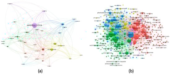 WO3 shows a more balanced distribution across energy, materials science, and environmental science. This structure reflects its multifunctionality: WO3 is investigated not only in the context of PEC devices [,], but also for applications such as electrochromic elements, sensors, and optical control coatings [,].