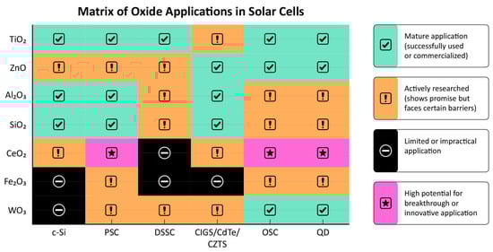 - A functional role matrix mapping the oxide materials to device architectures and layer functionalities (ETL, HTL, TCO, passivation, buffer, optical interlayer);