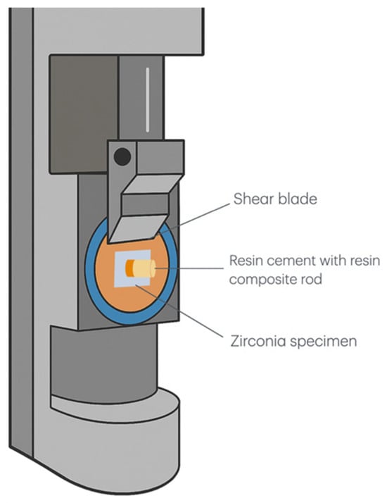 Schematic diagram of the shear bond strength testing apparatus. The setup shows a zirconia specimen bonded with a resin cement composite rod positioned under a shear blade for bond strength measurement. The shear blade applied force parallel to the bonding interface to determine the maximum load at failure.