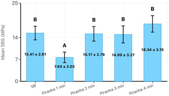 The mean shear bond strength and standard deviations of the experimental groups, where SB = Sandblast. Bars with the same letter are not significantly different (p > 0.05). Error bars represent standard deviation.