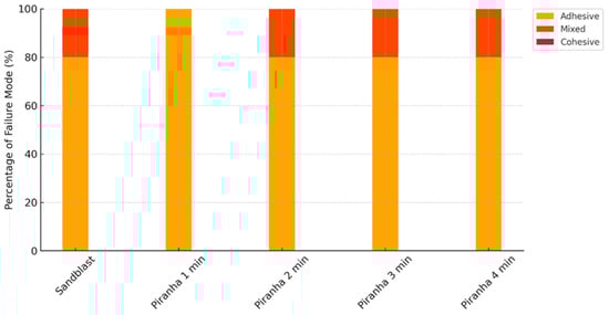 The remaining treatments—SB, Piranha 2 min, Piranha 3 min, and Piranha 4 min—formed a homogeneous group with no statistically significant differences between them (p > 0.05). Among these treatments, Piranha 4 min demonstrated the highest mean shear bond strength (18.34 ± 3.15 MPa), which was numerically higher than the control SB group, though this difference was not statistically significant. Similarly, Piranha 2 min and Piranha 3 min treatments showed comparable performance to the SB control group, with non-significant mean differences of −0.245 MPa and −0.414 MPa, respectively. Importantly, the failure mode analysis supported these bond strength findings, as all effective treatment groups (SB, Piranha 2 min, Piranha 3 min, and Piranha 4 min) exhibited similar failure patterns consisting of 80% adhesive failures and 20% mixed failures. The presence of mixed failures in these groups (Figure 3), characterized by partial cement remnants adhering to the zirconia surface, suggests improved interfacial bonding where some areas achieved bond strengths approaching or exceeding the cohesive strength of the resin cement itself. This contrasts markedly with the exclusively adhesive failure pattern observed in the inadequately treated Piranha 1 min group, confirming that sufficient treatment duration is critical for achieving reliable interfacial modification and optimal bonding performance.