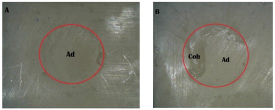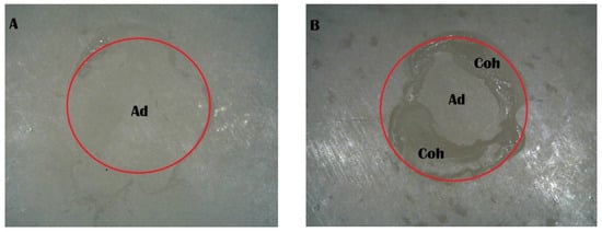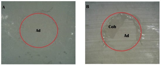 Stereomicroscope images of the Piranha 4 min group: (A) adhesive failure; (B) mixed failure (Ad, adhesive failure; Coh, cohesive failure in resin cement).