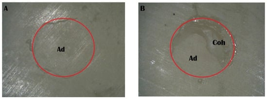 Stereomicroscope images of the sandblast group: (A) adhesive failure; (B) mixed failure (Ad, adhesive failure; Coh, cohesive failure in resin cement).